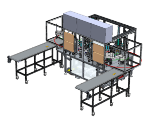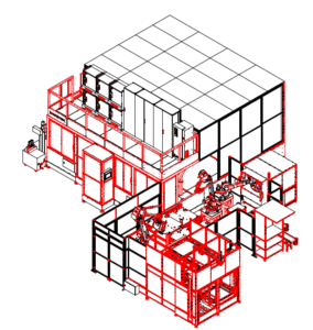 Robotska celica za lepljenje, sestavo, kontrolo kvalitete izdelkov in njihovo pakiranje. 7 robotov.